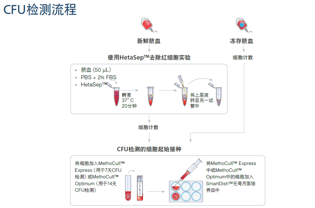 使用HetaSep™从50 μL新鲜脐血(CB)样品中去除红细胞(RBCs)。对预先冻存而经解冻的CB细胞,可免去这一步骤。根据是否需在14天后对不同类型的集落形成单位(CFU)亚型进行区分(MethoCult™ Optimum培养基),或只需在7天后对总CFU进行计数(MethoCult™ Express培养基),而将新鲜或解冻的CB细胞培养于合适的MethoCult™培养基中。STEMvision™对培养皿进行图像采集,再通过分析图像对不同集落类型进行鉴定和计数。脐血单位中CFU的比例和总数的测定结果可记录于打印报告中。打印报告的表格有两种形式,一种用于实验室,另一种则提供给家长(可选)。