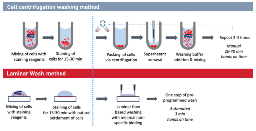 流式细胞术检测悬浮细胞前的免疫染色工作流程比较。层流清洗技术在清洗细胞层 面,与离心法一样高效,但结果差异性和对细胞造成的压力上远小于离心法。