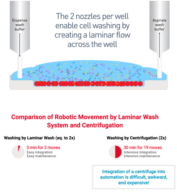 使用特别设计的无壁板96孔板,孔板可以一次性用完,也可以每次只使用一部分,细胞和试剂直接加入孔中。重力导致细胞沉降到孔板的底部。层流洗涤系统使用每孔的两个喷嘴 在孔内制造出层流。通过扩散,未结合的抗体向细胞层上方移动,进而被层流洗走。在层流洗涤系统里的7个循环相当于在流式管中离心洗2次。